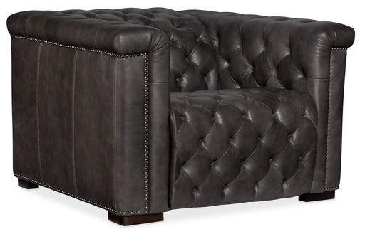 Traditional elegance is redefined in the Whitton Recliner. Wrapped in Studio Chocolate leather, it features spaced nailhead detailing, wood-accente...