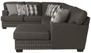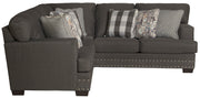 The contemporary farmhouse styling of the Crawford sectional brings comfort and style to any room. The seats are constructed of individually pocketed coils encased in foam and topped with a layer of cool gel infused memory foam for a long lasting, comfortable and supportive seat. Covered in a soft durable 100% polyester fabric the Crawford is durable enough for use in a family room, basement or bonus room. The exceptional styling shows through with the included decorator accent pillows and nickel nail head accents along the base rail.