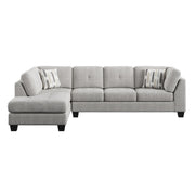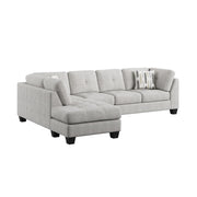 • The Myles chaise sectional brings a sense of relaxed sophistication to your space. The chaise sectional, featuring contemporary tufting on both cushions and frame and sturdy solid wood legs, strikes a balance between modern design and lasting comfort. A storage cocktail ottoman keeps essentials close at hand yet out of sight. A roomy swivel chair invites you to sink in and unwind, offering a cozy spot to relax or enjoy conversation. Upholstered in light gray chenille with a faint patterned texture, this contemporary collection is designed for spaces where style meets everyday living..
