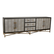 A contemporary homage to the timeless allure of Art Deco, the Mako sideboard infuses understated sophistication with rich visual texture and enduring style. This striking storage solution is artfully crafted with a grey oak frame, upholstered with luxurious vegan leather and adorned with antique gold-finished accents for a harmonious blend of subtlety and depth.