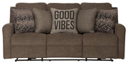 Calvin has a transitional design with a modified track arm and soft chenille fabric. A fashionable mix of accent pillows includes a "Good Vibes" emoji pillow. Calvin is available in your choice of two colors - Otter or Putty.