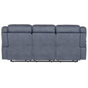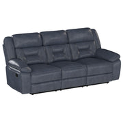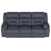 With its plush headrest, pillow-top arms, and precisely placed lines of tufting on the backrests, the Declan collection is ready to set sail. This transitional reclining sofa, loveseat, and chair effortlessly fit into both contemporary and casual living rooms. Featuring a smooth metal motion lever for easy reclining, the durable genuine leather upholstery provides lasting comfort where it matters most, complemented by matching faux leather on the sides and back. The swivel glider recliner chair is a true captain’s chair, with a smooth glide and swivel mechanism perfect for navigating your downtime. In a calming dark blue-gray hue, the Declan collection makes every living space feel like your personal harbor.