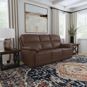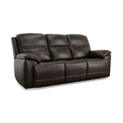 Inviting comfort and long-lasting support will make you want to stay nestled all day and night in the Jackson leather power reclining sofa. This sofa offers fine-tunable relaxation on the two outside seats with a dual power recline mechanism, adjustable headrests and Zero Gravity technology that reduces tension and pressure on the body. An attractive cross-stitch pattern on the back, armrest edges and footrests add distinctive style, while the waterfall chaise footrests and pillowy arms provide comfortable support. Built-in USB ports keep mobile devices conveniently charged and ready for streaming. With Flexsteel's patented Blue Steel Spring™ at the heart of each seat, and high-quality, dark brown leather, the Jackson power reclining sofa brings durability and a touch of rugged style to your home.