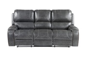 Superior comfort and style are the hallmarks of this motion set. Featuring a leather-like cover with baseball stitching, this ensemble comes with a Sofa with a drop-down console & USB charging station. Antiqued brass nailhead trim and padded arms complete this ultimate motion package.