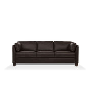 The Matias sofa set is one you’ll want to spend lots of time in. This beautiful dusty white or chocolate leather sofa features contrast tone stitching and unique wooden block legs. Its deep, comfy seat and sloped style padded arms with pillow give it an incredible sink-right-in quality that’s perfect for the whole family.