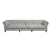 The luxurious top-grain leather and classic Chesterfield silhouette bring a clubby feel to our Ofer sofa. Deep-seated and sheltering, the square-profiled sofa features classic button-tufting, rolled arms, and neat tailoring. Its cushions are filled with full foam that provides luxurious comfort. The bun wooden legs have a dark finish to bring out the bright character of the white and vintage look of the leather.