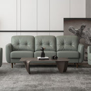 Combining the stunning visual effect of art with lines and comfort, the Radwan sofa set is one you’ll want to spend lots of time in. This beautiful caramel or pesto green leather sofa features button tufted cushions with contrast tone stitching and unique tapered wood legs. Its deep, comfy seat and flared padded arms give it an incredible sink-right-in quality that’s perfect for the whole family.