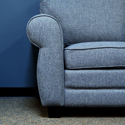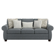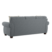 High contrast and eye-catching patterns make the Royce collection an extraordinary transitional design. The closer you get, the more the details come alive from the abstract leaf print on the ottoman and pillows, to a linear geometric print on the accent chair and additional pillows, and an unforgettably cozy boucle kidney pillow. All these creamy-toned pillows flatteringly coordinate with the cool gray body fabric on the sofa and loveseat. Finished off with welted details and classic rolled arms, the Royce will be the timeless additional to your home.