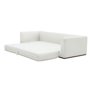 The Rue sleeper sofa effortlessly transforms from a chic sofa to a comfortable sleeper. Its back cushions can be removed, and the seat folds down to rest on the floor, creating a mattress that offers spaciousness between a double and queen size. Filled with a luxurious 70% feather fill and featuring a bench seat design, the sofa's rubber wood base creates a unique floating appearance.
