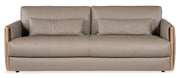 In a light and airy modern style, the Meridian Sofa has exposed wood trim on the arm fronts and is covered in the soft-colored Miami Truffle semi-aniline top grain leather, accented by designer topstitch trim and two kidney pillows.