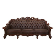 Assembled, with 4 Pillows Oversized Scrolled Trim: Vintage Hand-Brush, Nailhead (Backrest, Front Armrest & Base) Backrest Style: Arched (Inside Button Tufted) Tight Back & Loose Seat Cushion (1+3) CONSTRUCTION] SEAT: Pocket Coil, Foam; Inside Frame: Solid Wood+Ply () Box Seat Cushion with Welt Trim, Not Reversible Armrest: Rolled with Scrolled Molding Oversized Scrolled Leg Material: PU () Pillows: Contrast Shapes & Patterns (Removable Covers)