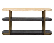 The Avalon console table seamlessly blends modern aesthetics with contemporary elegance. Its design harmoniously combines wood, stone, and metal elements, presenting a luxurious yet understated appeal. Crafted with a beige travertine stone top, a bronze-finished metal frame, and espresso oak-finished shelving, this piece exudes sophistication. As travertine is a porous natural stone, expect variations in veining and color, adding to its distinctive character. With its modern-luxe aesthetic and meticulous attention to detail, the Avalon console table is the epitome of refined taste, perfect for elevating any living space.