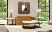 The Avalon end table embodies a seamless blend of modern and contemporary elements, exuding sophistication and timeless elegance. Crafted with a trio of mixed materials, including beige travertine stone for the top, a bronze-finished metal frame, and an espresso oak-finished bottom shelf, this piece adds a touch of luxury to any space. As travertine is a porous natural stone, each table boasts unique variations in veining and color, ensuring its individuality. With its modern-luxe design and meticulous attention to detail, the Avalon end table is a testament to exquisite craftsmanship and refined taste, making it a versatile addition to any home decor scheme.