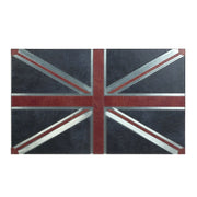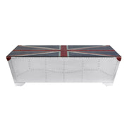 Our famous Brancaster collection now includes a Union Jack-printed coffee table. It is constructed with high-quality aluminum that will last for years of use. The tabletop print on this coffee table is protected by the clear glass top, which also makes for easy cleanup and maintenance—it is adorned with rivets throughout the frame for an industrial edge making this a modern, eye-catching piece in any living room.