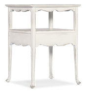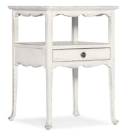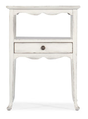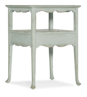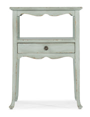 Capturing the vintage charm of the coastal South, this delightful accent table is crafted of Maple Veneers and has scalloped accent trim. The one drawer has self-close drawer guides and a matching-finish interior. The table finish is a soft color which can be found on the ceilings of porches and entryways, window shutters and doors in the American South, dating back more than 200 years from the Gullah folklore that held the color kept “haints” or spirits from entering homes and dwellings. The table is finished on all sides so it can be floated in a room. The round pull knob is in an antique bronze color.