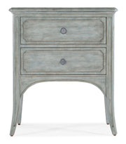 Capturing the vintage charm of coastal locales, the Charleston Two-Drawer Accent Table has an arched design between the understated cabriole legs and framed door fronts. Crafted of Hickory Veneers with solid wood tops, the table is finished in Waterscape Blue, a stain and paint combination with a transparent blue-green coloration, allowing you to see into the natural grain of the wood. The decorative bail pulls have an antique pewter finish with white hang up. Two self-closing drawers.