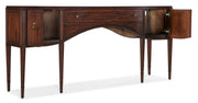 Honor the majestic beauty of the Federal and Georgian design period with the heirloom-quality Charleston Console Table. Featuring thin tapered legs, a curved case front and walnut inlay border on the top and door and drawer fronts, the table has two doors with soft-close hinges and one center drawer with self-close drawer guides. Crafted of Cherry Veneers and Walnut Inlay, it is finished in Maraschino Cherry using natural grain Cherry Veneers showcasing dramatic cathedral patterns in the wood. The pendant and round pulls are finished in an antique bronze color.