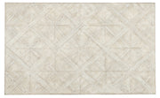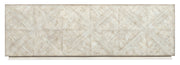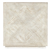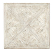 Block Buster Table is crafted of Pine with parquet-patterned veneers in a creamy white finish with rub-through and distressing and a plinth base.