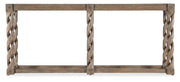 Exuding craftsmanship with attention to detail, the casual Jack O’Bein Console Table has twisted legs and a paned veneer top with peg accents. Crafted of Pine Veneers, it has a medium wood finish. At 78 inches wide and only 14 inches deep, it fits into narrow spaces beautifully.