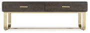 The Metropolitan Cocktail Table is a soft modern silhouette combining Oak Veneers in a dark wood finish with a rounded gold metal base and accents. A rectangle shape measuring 52 inches wide by 28 inches deep, it has two drawers with soft-close drawer guides.