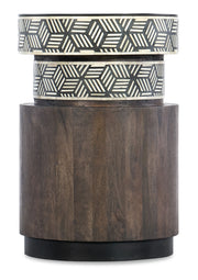 Exotic, eclectic and earthy, the Vector Side Table is crafted of Mango Solids and Iron with Bone Inlay on the top two sections. Featuring a round shape and stepped design, it has a natural dark wood finish with black and white bone inlay on the top two sections with a black top.