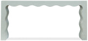 Wrapped in a blue-green painted raffia, this narrow console table makes a bold, coastal-inspired style statement with its scalloped design.
