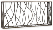 Organic and modern, this striking console table in a neutral color palette has a curvy steel base and natural stone top of Travertine Marble to create an inviting focal point.