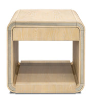 The Damone End Table features a refined, modern silhouette crafted from white oak veneers in a casual blonde oak finish. Accented with elegant antique mirrored detailing, it adds a sophisticated touch to any living space. The design includes a single drawer with full-extension side mount glides, providing convenient storage for essentials. With its versatile style, this end table complements a range of decor, making it a perfect addition to both casual and formal settings.