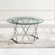 A sophisticated modern silhouette, the Escondido Cocktail Table offers a sparkle to any room. A tempered glass top and chrome plated base combines with geometric angles in an architecturally styled base. The 36-inch round table works well with sectionals and sofa and loveseat sets to add a gentle flowing aesthetic and easy access around the table.