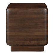 The Eton side table is a study in contrasts, marrying bold geometry with gentle curves. Crafted from rich Acacia wood, the substantial top appears to float above a recessed base, creating visual intrigue. Each piece showcases unique grain patterns through its thoughtful design and natural beauty as its dark brown finish matures the overall look.