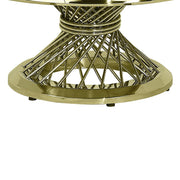 Explore the design power of mixed motifs in a round coffee table that promises to lift the ambiance in a modern space. This coffee table is constructed of lush gold finish stainless steel in a ring apron and twisted open rod cinched pedestal. Gold stainless steel configures an unusually shaped base with well-placed diminutive feet to protect flooring. Attention turns to an accessible, artificial marble top with a brilliant white finish, perfect for adding bright beauty to a living room or family room.