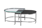 Meet the Hensley Cocktail Table, a stylish representation of glam-inspired design. This two-piece nesting table set features half-oval shaped frames in a satin-nickel finish, adding a touch of sophistication to your living area. The taller table is adorned with a clear, tempered glass top, while the nesting table showcases a beautiful black marble top. With added casters for easy movement, the Hensley Cocktail Table combines both elegance and practicality, making it a fine addition to your home decor.