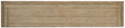 The striking Bexar Leg Huntboard is crafted in a carved gambel oak motif inspired by the scrub oaks that are prominent in the American West. The Sandstone finished with characteristic aged black highlights is reminiscent of the sandstone quarried in Texas Hill country for centuries. The huntboard has one fixed wood shelf and two drawers.