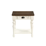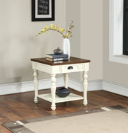 Add farmhouse charm to your living area with the Joanna End Table. Gracefully turned legs combine with a two-tone ivory and mocha finish for an inviting look that works well with any farmhouse or cottage upholstery. A working drawer with half-moon nickel hardware adds hidden storage to any room while the units's bottom shelf adds storage and/or display area. Matching Sofa Bar and dining sets are available from this comprehensive farmhouse collection.
