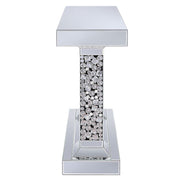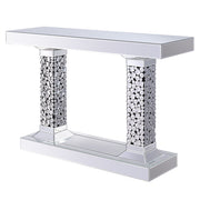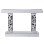 The Kachina Console Table will add a contemporary touch to any room in your home. With its clean lines, this brilliant rectangular occasional table showcases a distinctive style for an intriguing look. The table features tempered glass and a fully mirrored frame with mirror base with columns encrusted with a spectacular faux gem inlay. This beautiful accent table will modernize any space you place it.