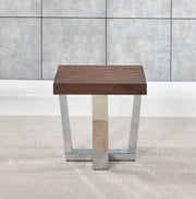 A rustic modern take on the treditional Side Table. Whether in a living room or bedroom, the Laredo brings a casual elegance to any setting. A hand-stained Chestnut finish balances the sparkle from the chrome finished base in a mixed media package with both character and style.