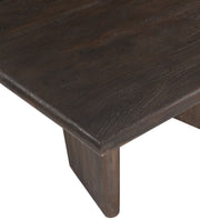 The Lasso Rectangular Cocktail Table features a modern organic inspired design. The thick, soft-edged table top sits on a unique, offset tapered base design. This cocktail table is constructed with solid mango wood that's been sandblasted for texture with a deep, antiqued brown stain that highlights the features of the natural wood. Look for other items in the Lasso Collection to complete the set.