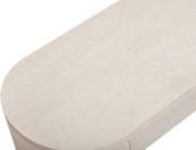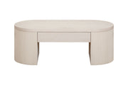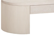 The Lena Coffee Table offers a sleek modern design, featuring cerused white oak veneers in a driftwood finish. Its pill-shaped form includes a practical storage drawer, blending functionality with style. The tables reeded accents in a faux plaster finish add texture and sophistication. Perfect for elevating any living space with its refined, contemporary look.
