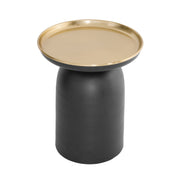 The Leta Accent Table features a modern design with a round, bulbous base with round, tray-style top. Constructed with steel, and features a polished brass and matte black two-tone finish.