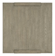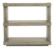 Organic and rustic with a modern silhouette, the Overlook Trails End Table has two open spaces, one fixed shelf and a plinth base. Crafted of Oak Veneers, the table is finish in Mink, a soft smoked gray.