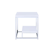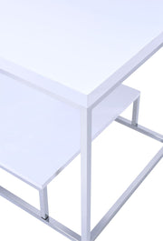 A contemporary collection of tables featuring chrome bases and white tops. An asymmetrical bottom shelf adds function as well as style to the collection and the Silvershield® top adds beauty and texture to the cocktail and end table.