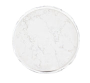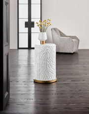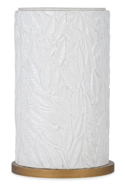 Serene and elegant in a white and gold color scheme, the Be-Leaf In Me Accent Table has a compact 15 ½ x 15 ½ round shape. Crafted of Resin and Quartz, the table has a white finish over a raised leaf motif, a Quartz top and a brushed gold base.