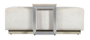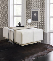 In a user-friendly modern design, the rectangle-shaped Bridged Cocktail Table is upholstered in cream-colored hair-on-hide leather and features a convenient mobile tray top for keeping beverages, snacks or electronics within reach. The tray-top legs are metal-wrapped with a light-finished wood top that matches the wood plinth base.