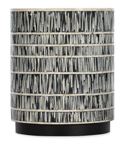 With a global design inspiration and a dynamic palette, the Callum Round Accent Table features white bone inlay over a black finish with a metal plinth base for a world-traveled vibe.