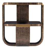 With a unique silhouette and X-motif base, the Edmun Side Table is a striking addition to any living space. Featuring a rectangle shape with rounded edges, the table is crafted of Maple Veneers in a dark wood finish with gold accents. One fixed shelf.