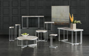 With a convenient C-shape and compact 12 x 12 footprint, the Marin Drink Table combines Pewter Metal on the base with a Tumbled White Onyx top for an eclectic blending of elegant, organic materials.