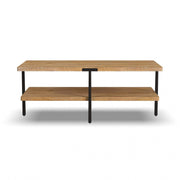 Sophistication meets rustic, industrial charm with the Millwork rectangular coffee table. Seamlessly blending high-contrast materials and finishes in perfect harmony, this table makes a captivating statement in any living space. A textured steel frame is highlighted by warm copper undertones, while a distinctive wood top and lower shelf exude character with natural knots, subtle saw marks and a white cerused finish that accentuates the rich umber wood grain.