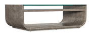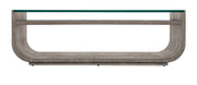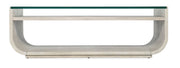 Architectural and timeless with a luxe mixture of materials, the striking Modern Mood Rectangle Cocktail Table has a raffia-wrapped shelf beneath a one-inch-thick tempered glass top. With rounded sides, the table is crafted of Oak Veneers with tactile wire-brush detailing in a light Diamond finish with crystal-like alabaster and pewter hues, offering soft sophistication.