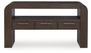 Elevate the everyday with this console table. A rich medium brown finish brings added flexibility, complementing a variety of casual contemporary color schemes. Rounded corners soften the look. Drawers invite miscellaneous storage, while the open shelf encourages you to dress it up with decorative details. Adding chic sofa-side form and function, this console lends an approachably luxe vibe to your space.