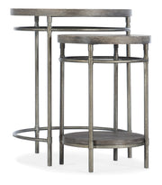 Beautifully scaled and intricately designed, this pair of nesting tables are crafted of Acacia Veneers with a starburst veneer pattern on both tops in a medium natural wood tone and a textured metal frame in a golden brown. The smaller table slides underneath the larger table and has a starburst veneer pattern on both tops.